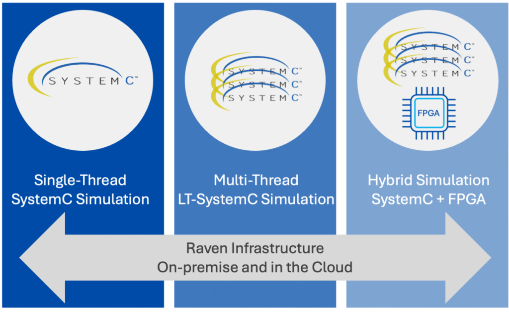 RAVEN is compatible with the Accellera SystemC reference implementation to simplify integration into existing workflows, while its cloud-based capabilities enable flexible and scalable simulation environments.